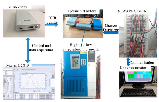 Compared with lithium nickel manganese cobalt oxide batteries, lithium iron phosphate batteries are safer, cost effective, and have lower source dependency such that they are widely used in heavy-duty EV, such as electric buses. We focused on how to solve the problems of aging and its potential negative influence on the safety of electric buses. Therefore, we chose a lithium iron phosphate battery for the experiment. Here a cylindrical 32,650 commercial LiFePO4 power battery with a nominal capacity of 5 Ah was used. Its working voltage was 3.2 V, and the cutoff voltages for charging and discharging were 3.65 and 2.5 V, respectively. The diameter of the battery was 32.2 ± 0.5 mm; the height was 69.8 ± 0.2 mm, and the weight was 145 ± 2 g. The basic parameters of the battery are shown in Table 2. Figure 4 shows the experimental platform: an electrochemical workstation, charging and discharging motor, high- and low-temperature thermostat, data-acquisition terminal, upper computer, and battery. The 5 A/10 V Vertex electrochemical workstation (Ivium Company, the Netherlands) was used for the electrochemical test. The potential range was ±10 V; the current range was ±10 nA to ±10 A, and the minimum current resolution was 15 pA. The frequency range of AC impedance was 10 uHz to 1 MHz. The workstation can be used for multiple electrochemical tests, such as AC impedance, chronoamperometry, chronopotentiometry, cyclic voltammetry, and linear sweep voltammetry. These tests are used to measure and verify the DCIR of experimental batteries. The Neware CT-4016 16 channel battery test system was adopted. The voltage measurement range of each channel was 25 mV to 5 V, and the accuracy was 0.1% of the full range (i.e., 5 mV). The current output range was 0.15–30 A, and the accuracy can reach 0.03 A. The test system had the functions of charge–discharge, cycle, and DCIR tests.