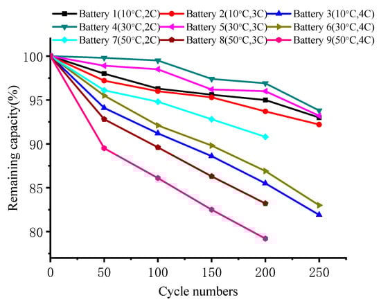 Table 3 shows the numbered experimental batteries corresponding to different aging paths. The ratio of the battery capacity after a charge–discharge cycle to the initial battery capacity was used to characterize the aging characteristics. Figure 5 shows the changes in the battery capacity in different aging paths. As the number of cycles increased, the battery capacity was affected in different ways by the aging paths. For temperature, capacity deterioration accelerated as the temperature increased from room temperature and was most severe at 50 °C. After only approximately 200 cycles, Batteries 8 and 9 were close to or had exceeded the end of life (EOL) specified by the United States Advanced Battery Consortium LLC (USABC) (i.e., 80% of their initial capacity) [,]. The capacity deterioration was also significant at 10 °C; Battery 3 was close to the EOL after 250 cycles. For the charging rate, the results for Batteries 1, 2, 4, and 5 indicated that the capacity deterioration was similar at charging rates of 2 and 3 C and temperatures of 10 and 30 °C. The three charging rates only had significantly different effects at 50 °C. This was because the high temperature intensified the side reactions, which consumed the active lithium ions in the batteries.