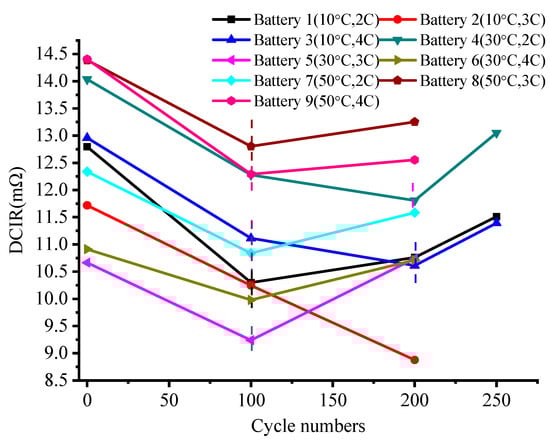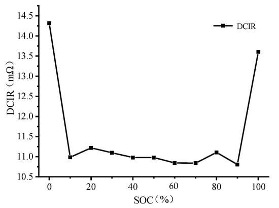 In addition to the available capacity, the battery impedance is another indicator of SOH []. The impedance is an important parameter that reflects the difficulty of lithium-ion transfer in the battery. The total impedance includes the DCIR and polarization impedance. The response generated by the current excitation from the DCIR is immediate, whereas the response to the polarization internal resistance is delayed; this is because the lithium-ion diffusion rate involved in the chemical reactions in the solid phase of the active electrode material is less than the chemical reaction rate [,]. The DCIR is related to the temperature, current ratio, SOC, and SOH []. Figure 6 shows the DCIR from 0% SOC to 100% SOC when the battery was charged at 1 C at 25 °C. The tested battery was fresh prior to cycling. The DCIR was significantly higher at 0% SOC and 100% SOC than at other values and had a small gap for a wide SOC range (10–90%). To facilitate comparison, Figure 7 shows the DCIR of each battery at 50% SOC as the number of cycles was increased. For all the batteries, the change in the DCIR with the number of cycles can be divided into two stages: an initial decrease, followed by an increase. Most inflection points occurred within the range of 100–200 cycles.