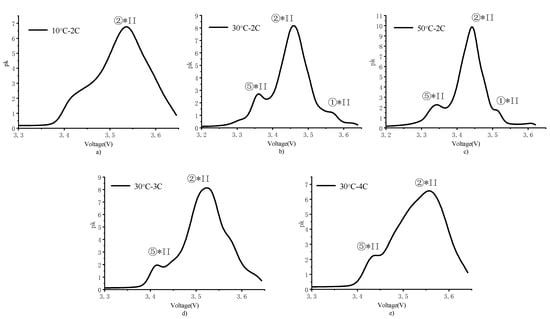 The PDF analysis method introduced in previous studies [,] was employed to evaluate the phase change reaction during the charge–discharge cycle test. The probability density, pk, can be used to reflect the change in capacity. Figure 8 shows magnified views of the PDF peaks at different temperatures and charging rates. The experimental results showed that the temperature and charging rate significantly influenced the integrity of the PDF peak of the battery. As shown in Figure 8b,c, at a charging rate of 2 C and temperatures of 30 and 50 °C, the ①*II, ②*II, and ⑤*II peaks were observed. Among them, “II” represents the 1-C peak corresponding to the pseudo-binary phase–transition phase of the positive pole, which was represented by ①–⑤ in the order of high to low voltages. The ①*II peak was extremely small because of the high rate and partial overlapping with the ②*II peak. Compared with their positions at 30 °C (i.e., close to room temperature), the peaks slightly shifted to the right at a high temperature of 50 °C. This is because high temperatures improve the conductivity of the electrolyte and transport of lithium ions. The ion transmission between the electrodes and electrolyte accelerated, and the degree of polarization reduced, which advanced the phase change reaction. As shown in Figure 8a, at 2 C and 10 °C, the ①*II and ⑤*II peaks were absorbed by the ②*II peak, and the entire PDF curve shifted to the right. This indicated that the ion transport and chemical reaction were hindered, which reflected the poor performance of LiFePO4 batteries at low temperatures. At 30 °C, increasing the charging rate also caused the ①*II and ⑤*II peaks to converge toward the ②*II peak. As shown in Figure 8d,e, the PDF curves for 3 and 4 C showed that the ①*II peak was absorbed before the ⑤*II peak, indicating that the primary effect of the polarization generated by high charging rates was the corresponding reaction of ① (i.e., the conversion of LiC12 into LiC6). This reaction is kinetically slower than other negative-electrode reactions. The polarization caused the measured electrode surface potential to be out of phase with the reaction of the internal material. When the charging cutoff voltage was reached, the reaction potential inside the material was insufficient to induce a reaction. Therefore, the partial recombination of the ①*II and ②*II peaks resulted in an extremely small shift.