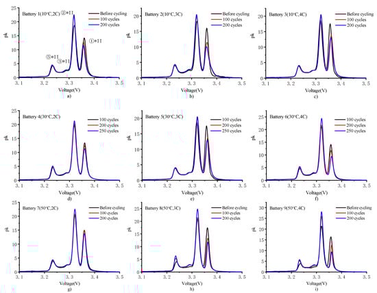 The peak position reflects the degree of the response delay of the battery’s internal phase transition to the voltage, and the peak size reflects the capacity ratio of the phase balance during the charging process. Figure 9 shows the change in the PDF curve of a battery at a small charging rate. As shown in Figure 9a–i, as the number of cycles increased, there was no significant change in the position and shape of each peak, and each phase change reaction occurred as usual. This indicated that the chemical properties of the electrodes did not change. The heights of the three peaks corresponded to the degree of progress in the phase transition, which comprehensively reflected the phase change reactions occurring at the positive and negative poles. The value of the ①*II peak reduced. This may have been caused by the continuous expansion and contraction of the carbon anode during the charge–discharge cycle, which led to structural damage and reduced the intercalation of lithium. Further thickening of the solid electrolyte interface (SEI) layer increased the internal resistance of the battery. As previously mentioned, the change in impedance caused the DCIR to initially decrease, then increase, but the resistance remained below the initial value after 200 cycles. Therefore, the blocking effect of the SEI layer on lithium ions was not the main reason for the reduction of the ①*II peak. The ②*II and ⑤*II peaks increased because the repeated insertion and extraction of lithium ions during the charge–discharge cycle caused the electrochemical grinding of the active material of the negative electrode. This increased the contact area with the lithium ions and promoted phase-transition reactions corresponding to the two peaks []. However, the shape and number of peaks did not change, indicating that the carbon anode structure was not damaged. Thus, the reduction of the ①*II peak was caused by the loss of active lithium ions.