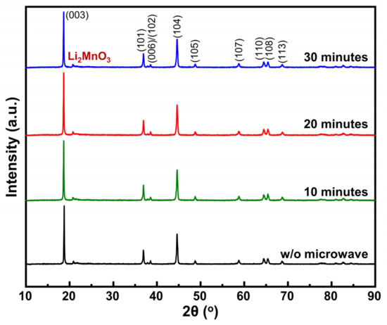 Microwave irradiation is a potential method that can be employed to treat the as-synthesized cathode materials [27]. Although its mechanism is not yet fully understood, microwave irradiation is known to cause a positive impact on the electrochemical performance of the cathode. Microwave treatment was utilized by Zhao et al. and Miao et al. on Li-rich Mn-based cathode materials that were produced via co-precipitation and hydrothermal synthesis, respectively. It could suppress the cation mixing in the samples, as indicated by the higher I(003)/I(104) in XRD results [28,29]. In accordance with the previous reports, Shi et al. also utilized microwave treatment on a hydrothermally synthesized Li-rich Mn-based cathode. The obtained sample showed an improved homogeneity of secondary particles and enhanced structural ordering, as indicated by the lower cation mixing and a lower R-factor [30].