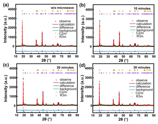 Rietveld refinement was then performed to further explore the influence of microwave treatment on the structure of the samples in more detail (Figure 2) and the refinement results are displayed in Table 1. The intensity ratio of (003) to (104) peaks (I(003)/I(104)) for the layered structure is usually employed to determine the degree of cation mixing. It can be seen that the I(003)/I(104) value of all samples is higher than 1.2, indicating the low cation mixing of all LNCM samples [37]. Moreover, the LNCM sample with 20 min of microwave treatment shows the highest I(003)/I(104) value (i.e., 2.015), indicating the lowest Li+/Ni2+ mixing degree among the samples. This value is higher than previously reported LNCM samples obtained via other synthesis methods (Supplementary Information Table S1), indicating that microwave treatment of LNCM synthesized by the solid-state method is a promising strategy to minimize structural disorders on the LNCM cathode materials.