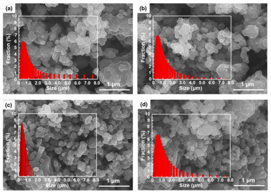 The SEM images of all LNCM samples shown in Figure 3 demonstrate a uniform platelet shape, identical to the morphology of the cathode particles obtained by the solid-state method [24,34]. Meanwhile, the particle size distribution of each LNCM sample is represented by the bar diagrams in the inset of Figure 3. As microwave irradiation reduces the tendency of the primary particles to agglomerate, the samples with microwave treatment (i.e., 10, 20, and 30 min of irradiation) exhibit a more homogeneous particle size distribution than the non-treated sample. The LNCM sample with 20 min of microwave treatment shows the most homogeneous particle size distribution, as shown by the narrowest size distribution. The uniform particle size provides a more homogenous interface reaction during contact with the electrolyte, which minimizes cathode electrolyte interface (CEI) formation and subsequently enhances capacity retention [22].