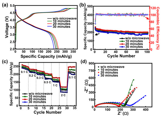 Meanwhile, charge transfer resistance (Rct) of the LNCM sample is represented by the diameter of the semicircle. The sample with 20 min of microwave treatment has the smallest Rct, suggesting its facile electrochemical reaction. Hence, according to material and electrochemical characterizations, the sample with 20 min of microwave treatment exhibits optimum performance, as indicated by the lowest cation mixing, the highest c/a ratio, the most homogeneous particle size distribution, and the superior electrochemical performance (i.e., large specific capacity, high initial Coulombic efficiency, superior rate capability, and stable cycling behavior).