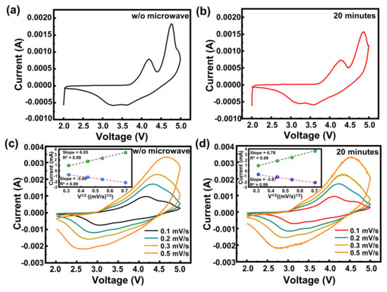Figure 5c,d shows the voltammograms of both samples measured at various scan rates starting from 0.1 to 0.5 mV/s). The peak current observed at different scan rates can be related to the rate of the Li-ion intercalation and deintercalation process, in which the diffusion coefficient can be extracted from the Randles–Sevcik equation. In this work, the exact value of the diffusion coefficient () was not calculated as some parameters are difficult to determine [50,51,52]. However, given that most of the parameters are constant, the slope of the linear relation between the peak current () and the square of the scan rate () can be directly related to the Li-ion diffusion coefficient. During the oxidation and reduction process, the slope value of vs. of 20 min sample is higher than that without microwave irradiation, indicating its higher diffusion coefficient as compared to the sample without microwave treatment. These results imply more efficient Li ion diffusion in the sample with 20 min of microwave treatment, leading to a better rate capability of this sample.