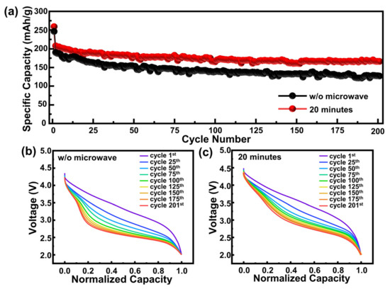 (a) Long-term cycling stability test of LNCM samples without and with 20 min of microwave treatment, and selected voltage discharge profiles of LNCM samples (b) without microwave treatment and (c) with 20 min of microwave treatment.