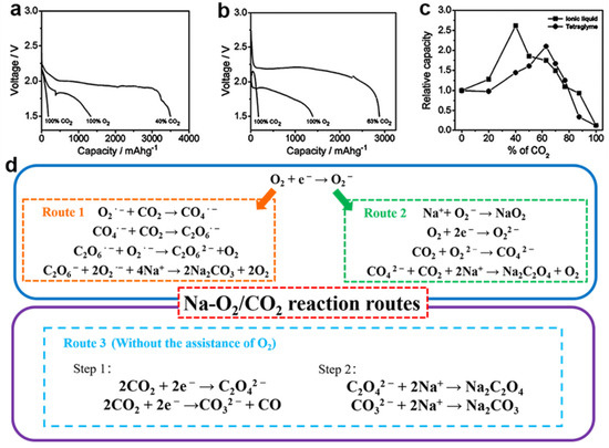 In 2011, Asaoka’s group found that adding CO2 to Li/Na-O2 batteries could increase its discharge capacity and energy density, demonstrating the feasibility of metal–CO2 batteries for the first time [12]. In 2013, Das et al. first designed a rechargeable O2-assisted Na-CO2 battery [13]. Under different partial pressures of CO2, the discharge capacity of rechargeable Na-CO2 (O2) battery with tetraethlene glycol dimethyl ether (TEGDME) and ionic liquid (IL) electrolyte increased by 2.6 times and 2.1 times, respectively (Figure 1b,c), the optimal CO2/O2 ratio of the maximum discharge capacity ranges from 40% to 70% (Figure 1c) [13]. The ex situ Fourier transformed infrared (FTIR) spectroscopy test and X-ray powder diffraction (XRD) analysis showed that Na2CO3 and Na2C2O4 exist simultaneously in TEGDME-based electrolyte; Na2C2O4 is the main discharge product in IL electrolyte. These results proved that the electrolyte solvent may determine the final discharge product by affecting the intermediate stability.
