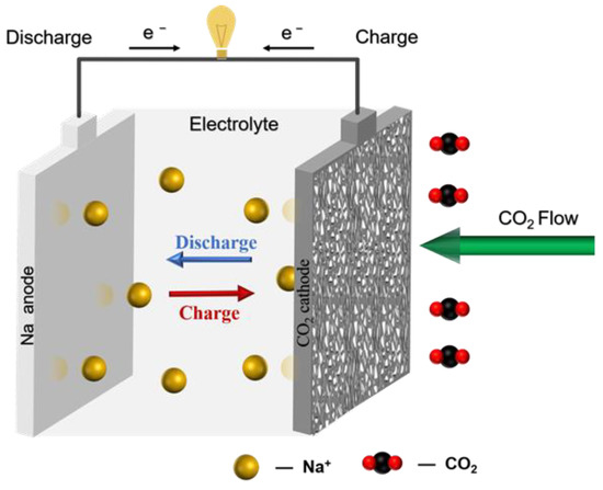 Metal–CO2 batteries (such as Li/Na/Zn/K-CO2 batteries) are a high energy density energy storage and power supply technology that enables CO2 fixation and conversion [1,2]. Among various kinds of metal–CO2 batteries, Na-CO2 batteries have attracted more attention because of the abundant resources of sodium metal and similar physical and chemical properties to lithium. Na-CO2 batteries exhibit better comprehensive performance, including high energy density (1.13 kWh kg−1), and relatively high working voltage (2.35 V) [3]. In addition, the abundance of metal sodium is 1352 times that of metal lithium, so the cost is lower (the price of metal sodium is 20-times cheaper than that of metal lithium) [4,5]. In addition, a Na-CO2 battery with the reaction of 4 Na + 3 CO2 ↔ 2 Na2CO3 + C (∆rG0m = −905.6 kJ mol−1) has a low reaction Gibbs free energy, which means that Na-CO2 batteries may have a low charging voltage and inhibit electrolyte decomposition, which is conducive to improving round-trip efficiency and prolonging service life [6,7]. Compared with Li+, Na+ as a charge carrier has other advantages, for example, sodium has a larger ionic radius and atomic mass than lithium, but the Stokes radius of sodium is smaller than lithium, so it has higher mobility and ionic conductivity, resulting in a smaller polarization [8]. Therefore, Na-CO2 batteries are widely considered to be a promising next generation energy storage power supply technology. However, the research of Na-CO2 batteries is still in its infancy, and there are problems, for example, the reaction mechanism is still unclear, the types of cathodic materials and catalytic activity are relatively limited, the ionic conductivity and interfacial stability of the solid electrolyte still need to be improved, the impedance between the electrode and the interface is large and dendrites grow at the metal anode interface during the reaction. These problems lead to unsatisfactory electrochemical performance, such as cycling stability, overpotential, rate capability and specific full discharge capacity of Na-CO2 batteries [9,10,11]. To solve these problems, it is necessary to comprehensively understand the reaction mechanism of Na-CO2 battery and clarify the possible origins of the issues.