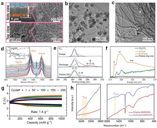(a) SEM image of t-MWCNT cathode at room temperature, from top to side view. (b) TEM image. (c) HRTEM image. (d) In situ Raman spectra and corresponding discharge/charge product distributions at 11 selected points. (e) XPS of Ag wire cathode in different states. (f) EELS. (g) Complete discharge/charge curves at 1 A g−1. Reproduced with permission [6]. Copyright 2016, John Wiley and Sons. (h) IR spectra of pristine and activated MWCNTS. Reproduced with permission [29]. Copyright 2019, Royal Society of Chemistry.
