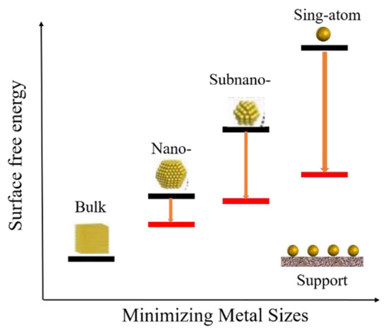 Schematic representation of surface free energy and specific activity of supported catalysts as a function of particle size.