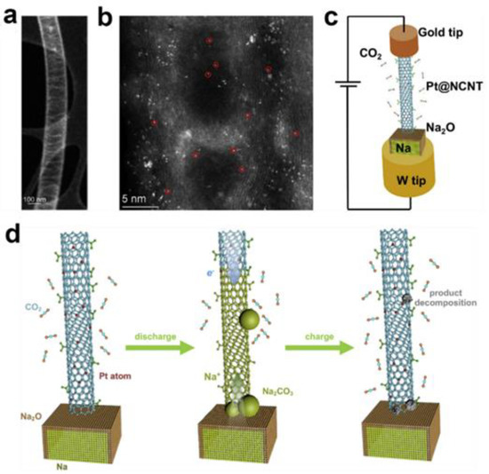 STEM-HAADF images of Pt@NCNT at low magnification (a) and high magnification (b). Red, circle in 7b shows the presence of single Pt atoms. (c) Schematic diagram of Na-CO2 nanobatteries constructed in ETEM. (d) Schematic diagram of the discharge/charge electrochemical processes in the Na-CO2 nanobattery. Reproduced with permission from [44]. Copyright 2020, Elsevier Ltd.