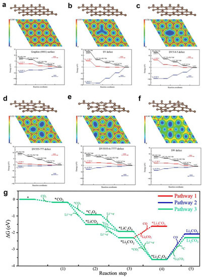 In addition to N element doping, density function theory (DFT) calculations show that F doping and B doping also improve the performance [37]. In addition, multi-element co-doping, N/S co-doping [38] and N/B co-doping [39] are also used. Cheng et al. adopted the S/N co-doping strategy to improve the physical and chemical properties of the cathode material [40]. They designed electrophilic S vacancies and nucleophilic N-doped active centers on the surface of ReS2, and used the synergistic coupling effect between heteroatoms to adjust the interaction of the catalyst with Li atoms and C/O atoms to show suitable adsorption during charging and discharging processes of Li-CO2 batteries, respectively, thus reducing the activation energy of the rate-determining step and thus increasing the reaction rate.