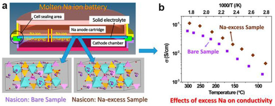 Inorganic solid electrolytes (ISEs) are usually characterized by high ionic conductivity (10−5~10−2 S cm−1), high ionic mobility number, mechanical rigidity, non-flammability and non-flow characteristics due to their structural properties [101]. In order to understand the reasons for the high ionic conductivity of ISEs and to further improve its ionic conductivity, it is necessary to understand its ionic transport mechanisms and properties. The three principal migration mechanisms shown in Figure 8a are vacancy leap, gap-site leap and linkage leap [102]. According to the mechanism of vacancy leap and gapsite leap ion transport, the ionic transport is mainly related to the activation energy of the material and the number of defects in the vacancy, so ion doping can effectively improve the ionic conductivity of the material [103,104,105]. The ionic transport in linkage leap is not directly jumping between vacancies, but knocking the ions of adjacent sites to make them migrate to vacancies, so the ionic transport potential of linkage leap mechanism is lower than that of vacancy or gap site leap, so increasing the concentration of sodium ions in ISEs can improve the ionic conductivity [106,107,108,109]. ISEs can be classified according to their components and crystal structure types: NASICON, Na-beta-Al2O3, sulfide electrolytes and complex hydride electrolytes.