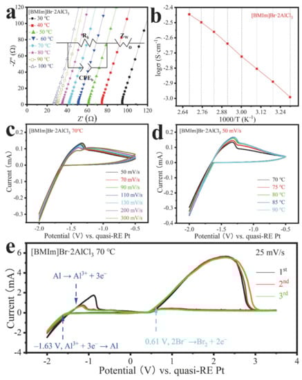 Electrochemical properties of [BMIm]Br·2AlCl3. (a) Magnified EIS. (inset: the equivalent circuit for simulation). (b) Temperature dependence of the ionic conductivity. (c) CV at 70 °C and different scan rates. (d) CV at a scan rate of 50 mV s−1 and different temperatures. (e) CV at 70 °C and 25 mV s−1 (firstly scanning toward the negative potential).