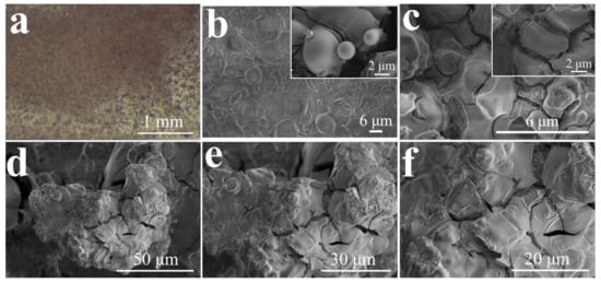 (a) Photograph of the Cu foil substrate after 2.5 h of Al electrodeposition at –1.70 V and 70 °C. SEM images or with enlarged details (inset) of the Al layer electrodeposited at –1.70 V (b), –1.85 V (c) at 70 °C or –1.85 V at 90 °C (d–f).