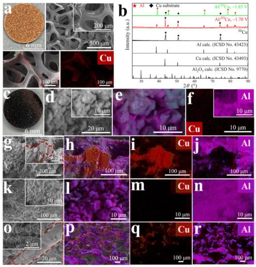 (a) Photograph, SEM images (enlarged details as inset) and EDX mappings of all elements of the Cu distribution of the pristine 3DCu substrate. (b) PXRD patterns comparison. (c) Photograph of Al/3DCu electrode electrodeposited at –1.70 V and 90 °C. Surface (d–f,k–n) and cross-sectional (g–j,o–r) SEM images (enlarged details as inset and skeleton structure of 3DCu indicated with red dotted lines) and EDX mappings of all elements of the Cu and Al distribution of the Al layer electrodeposited at –1.70 V (d–j) or –1.85 V (k–r) and 90 °C.