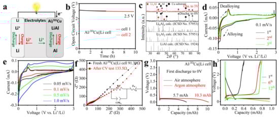 In the next step, we used Al/3DCu electrodes in LIBs of coin cell type (Figure 4a). The electrolyte was a solution of LiPF6 in ethylene carbonate and diethyl carbonate. The two assembled Al/3DCu||Li batteries had substantially overlapping open circuit voltage curves during 4.7 h and 9.7 h of rest, respectively, and eventually stabilized under 2.5 V, indicating the stability of the Al/3DCu electrode (Figure 4b). The PXRD of the discharged electrode shows a substantial broadening of the reflections of Al as well as additional reflections at 2θ angles of about 40° and 47° (CuKα1) that indicate the formation of LixAl alloys (Figure 4c and Figure S13a) []. It can be assumed that x decreases from the surface into the volume. In the CV curves, there are two sharp reduction peaks at 0.08 and 0.01 V, corresponding to the alloying reaction between Al and Li+ (Figure 4d vs. Figure 4c) []. These two sharp reductive peaks may be due to the different alloying depths of Al, for instance, LiAl, Li3Al2 or Li9Al4 []. In the anodic scan, only one peak near 0.51 V was observed from the first to the third cycle, which can be ascribed to the electrochemical release of Li+ from the LixAl alloy (Figure 4d vs. Figure 4c) []. The high degree of superposition of peaks in terms of sharpness, intensity, and position in the following CV cycles suggests good reversibility of the electrochemical reactions. As the scan rate increases, the two adjacent reduction peaks merge into one due to the presence of polarization, but the oxidation peak remains clearly discernible (Figure 4e). The burr peak in the high voltage range is due to a slight decomposition of the electrolyte. After CV testing, there was a slight increase in the EIS of the Al/3DCu||Li battery from 91.4 Ω to 133.5 Ω, which was likely due to the formation of a solid electrolyte interphase (SEI) film (Figure 4f) [].