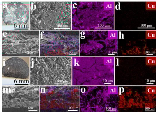 The cell maintained its performance over 12 cycles of 7 h each with a depth of discharge of approximately 1 mAh per cycle. The reason for the smaller charging capacity of the first cycle could be the formation of an SEI on the Al/3DCu electrode and the battery activation. The Coulombic efficiency was 82.4% after 12 cycles (Figure 4h). These performance indicators suggest the stable reversibility of Al/3DCu as electrode material in LIBs. Encouragingly, the alloying process during discharge of the battery did not result in visible powder shedding on the surface (Figure 5a–d) or interface (Figure 5e–h) of the LixAl/3DCu electrode. The formed LixAl alloy remains intimately attached to the 3DCu skeleton and exhibits good interfacial stability, convincingly illustrating volume expansion tolerance (Figure 5e–h vs. Figure 3o–r). After the charging process, i.e., the release of Li+ from the LixAl alloy, the Al coating remains compactly attached to 3DCu (Figure 5i–p and Figure S13b,c). It is worth pointing out that the angle of the sample taping is not perpendicular. Therefore, the Al signals shown are those of the surface and not of detached Al (Figure 5g,o).