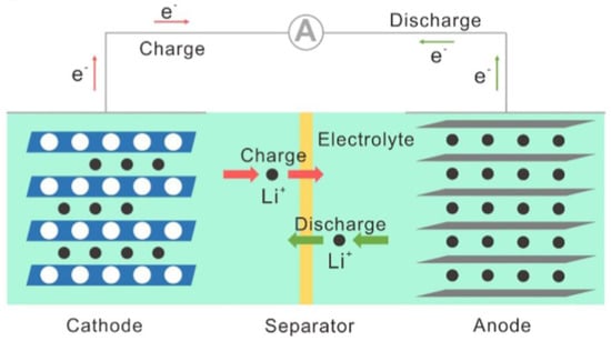 Due to their environmental protection and security features, electric vehicles have emerged as one of the primary modes of transportation for the development of smart cities in a low-carbon society [1,2,3]. The energy storage rate, service life (number of cycles), and relatively cheap cost are crucial factors for electric car energy storage systems. According to one theory [4], the storage system’s capital cost should be comparable to or lower than $250/kWh with a life span of 3900 cycles in order to be competitive. Compared to batteries such as lead–acid and nickel–hydrogen batteries, Li-ion batteries provide benefits such as a high voltage plateau, compact size, low weight, no pollution, recyclability, and high durability [5]. Currently, the lithium battery is starting to rule the sector of relatively brief power storage.