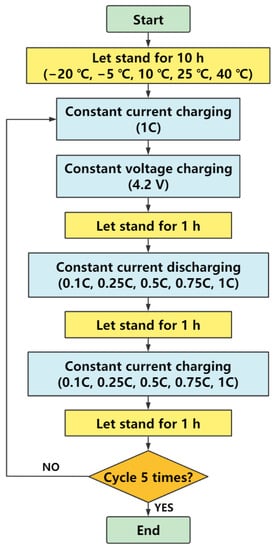 Figure 2 depicts the exact experimental procedure. The lithium battery should first be exposed to test temperatures of 40 °C, 25 °C, 10 °C, −5 °C, and −20 °C for 10 h before being charged with a constant current of 1C to the charging cut-off voltage (4.2 V) and then switching to constant-voltage charging. When the current rate is less than 0.05C, charging should be stopped. After resting for 1 h, charging and discharging experiments are performed. The protocol is to discharge the battery to the discharge termination voltage (2.75 V) at various rates of 1.00C, 0.75C, 0.50C, 0.25C, and 0.10C and then charge to the charge termination voltage at the same multiplier current [31].