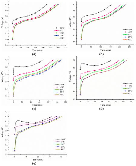 Figure 4 depicts the trend of the battery voltage change over time when charging at the same current rate at various test temperatures of 40 °C, 25 °C, 10 °C, −5 °C, and −20 °C. Except for −20 °C, the change pattern of the Li-ion battery voltage at the other temperatures indicated that the voltage rises rapidly for a period of time before the battery starts charging, and then the battery voltage changes more slowly as the charging time progresses, and the voltage level substantially increases once the charging is finished. When the test temperature is −20 °C, it can be seen that the terminal voltage of the lithium battery has a rebound phenomenon at the early stage of charging, and the greater the current, the greater the rebound amplitude. The 0.50C, 0.75C, and 1.00C charging stages rebounded by 0.0059 V, 0.045 V, and 0.0595 V, respectively.