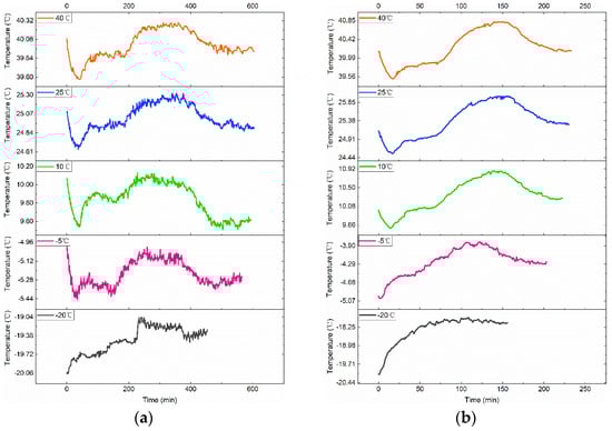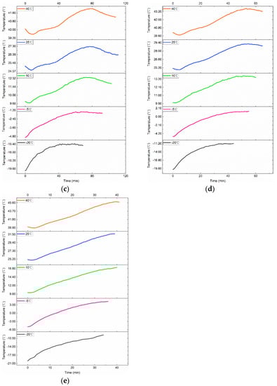 As seen in Figure 5, while charging at the same current rate at various test temperatures of 40 °C, 25 °C, 10 °C, −5 °C, and −20 °C, the trend of the battery surface temperature varies over time. At the beginning and end of charging due to the existence of the polarization phenomenon, the surface temperature of the Li-ion battery has a faster decline; the higher the charging current, the greater the decline. While in the VPP, the temperature will have a certain increase. The general trend of the battery surface temperature change curve appears to drop, then rise, and then decrease. When the test temperature is as low as −5 °C and −20 °C, or when the charging current increases to 0.75C and 1.00C, the decrease in the surface temperature of the battery at the beginning and end of charging is not obvious.