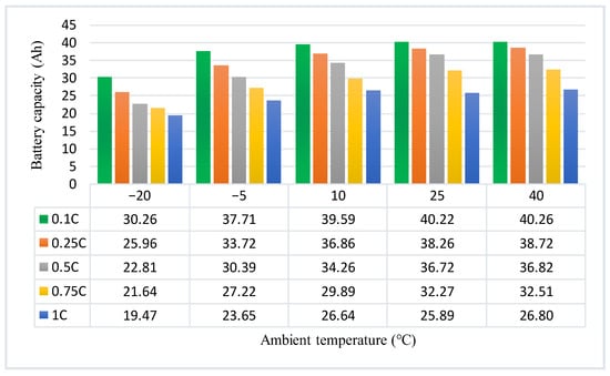 A comparison of the charging capacity under different experimental conditions is shown in Figure 6. It is clear that a greater ambient temperature will result in a slower charging rate and a larger charging capacity. At the identical test temperature and various currents, the maximum capacity differences between the groups are 10.79 Ah, 14.06 Ah, 12.95 Ah, 14.33 Ah, and 13.46 Ah. The greatest variance is approximately 36% of the rated capacity, which shows that the current rate has a greater impact on the charging capacity. As the charging rate increases, the faster the active material reacts, the faster the battery voltage increases, and the energy loss generated increases. Therefore, the actual charging capacity of the Li-ion battery with high current charging is lower than the charging capacity when charging with low current.
