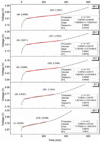 The fitted curve and fitted equation for the VPP at the 0.10C charge rate are depicted in Figure 7. It is clear that a linear regression equation can be used to fit the voltage plateau duration for each temperature environment, and the coefficient of determination, R2, is higher than 0.96. The slope of the equation is 7.7 × 10−4, and the values are 306, 302, 290, 262, and 213 at the respective test temperatures of 40 °C, 25 °C, 10 °C, −5 °C, and −20 °C. The time of the VPP decreases sequentially, and the low temperature effect in the charging phase is more obvious than that in the discharging phase [37].