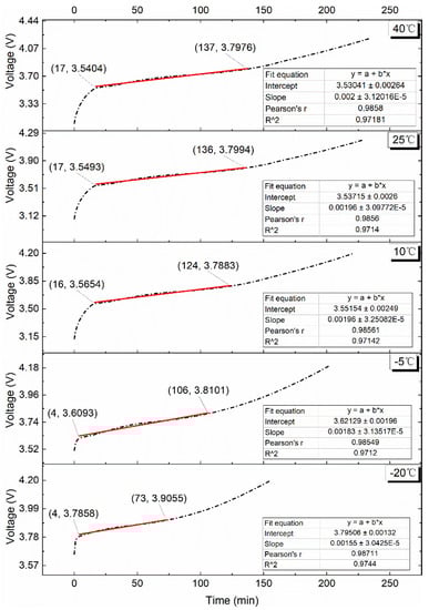 The fitted curve and fitted equation for the VPP at a charge rate of 0.25C are shown in Figure 9. It is clear that a linear regression equation can be used to fit the voltage plateau duration for each temperature environment, and the coefficient of determination, R2, is higher than 0.97. The slope of the equation is 2 × 10−3, and is approximately 120 at the test temperature of 10 °C, 25 °C, and 40 °C. At ambient temperatures of −5 °C and −20 °C, the slopes of equations are 1.83 × 10−3 and 1.55 × 10−3, and the values are 102 and 69, respectively. Consistent with the overall charging curve trend, the voltage plateau time is shorter at a low temperature.