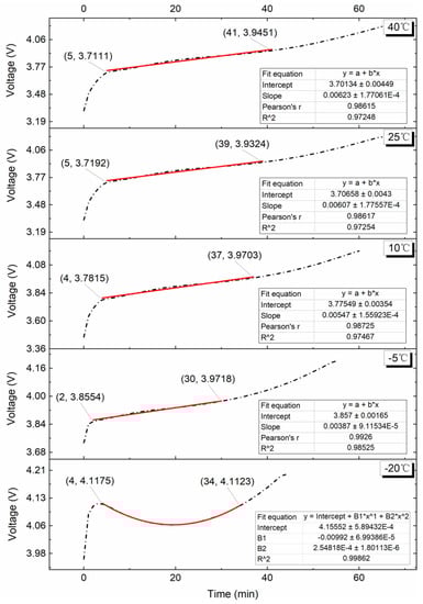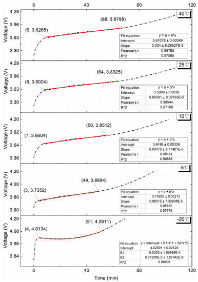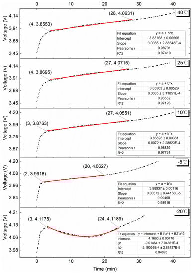 Figure 15 depicts the fitted curve and fitted equation for the VPP at a 1.00C charge rate. As can be observed, linear regression models with R2 values higher than 0.97 may be used to match the voltage plateau durations for test temperatures of 40 °C, 25 °C, 10 °C, and −5 °C. The slopes of the linear equations are 8.5 × 10−3, 8.5 × 10−3, 7.2 × 10−3, and 3.72 × 10−3, and the values are 24, 23, 24, and 18, respectively. As the ambient temperature decreases, the VPP basically maintains the law that the variation amplitude decreases and the duration shortens. When the test temperature is −20 °C, the terminal voltage of the lithium batteries rebounds by 0.0595 V at the initial period of charging. The fitted polynomial equation of the voltage rebound stage is shown in the following equation.