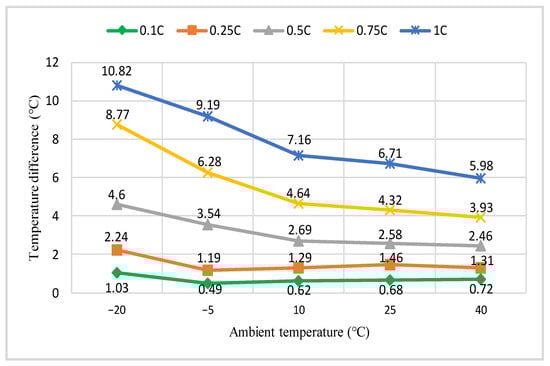 Figure 17 depicts the highest temperature difference of the battery surface during the charging process and demonstrates that in general, the higher the charging rate, the lower the ambient temperature, and thus the larger the temperature difference. The temperature difference of the battery surface is merely 0.49 °C under the condition of −5 °C and 0.1C; at −20 °C and 1C, the temperature differential is 10.82 °C, which is 22 times the minimal level. Since the diffusion and migration of lithium ions slow down at low temperatures and the electrolyte viscosity increases, the temperature rise of a lithium-ion battery is larger at low temperatures than at high temperatures. This is because the battery’s internal resistance rises as a result. Li-ion batteries produce heat at a rate that is proportional to their internal resistance while they are operating; therefore, an increase in internal resistance at low temperatures causes the battery to produce more heat and rise in temperature more quickly [38].