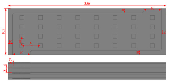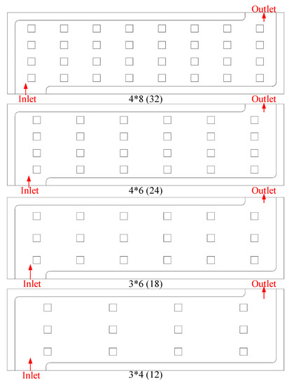 In this part, based on the square section pin-fin scheme, the effect of different pin-fins number on thermal performance is analyzed. To exclude the influence of other factors besides the number, the pin-fin size is set as the size of the square section pin-fin in Section 4.1 and is uniformly arranged along the length direction and width direction. Here, the arrangement schemes with 4 × 8, 4 × 6, 3 × 6, and 3 × 4 pin-fins are analyzed. Figure 10 shows the cooling plate.