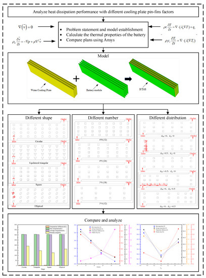 Based on the above modeling and calculation, this section analyzed the effect of the number, shape, and distribution of the cooling plate’s pin-fins on the thermal performance and power consumption of the battery. During the analysis of the three effect factors, the cooling plate’s size does not change, but only the pin-fins’ size in the cooling plate.