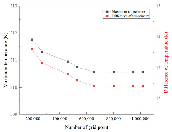 Taking the grid numbers 192,350, 270,111, 459,729, 528,492, 653,709, 804,919, 943,608, and 1,017,107 for the grid independence test. The grid meshed in the MESH module and the grid quality were both better than 0.75. The calculated temperature difference and maximum temperature are shown in Figure 5. The changes in temperature difference and maximum temperature after the number of grids is 653,709 are small and nearly stable, and the changes in the number of grids have a small impact on the temperature. Therefore, to satisfy the calculation accuracy and efficiency at the same time, select the grid number 653,709 division scheme in this work, as shown in Figure 6.