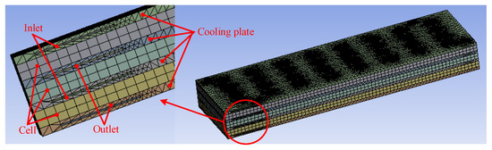 The battery type used in this work to study the dissipation scheme is a TLP80A5E6-50AH rechargeable LIB (The cathode material of the battery is lithium nickel-cobalt-manganate material, and the anode material is graphite). Figure 1 shows its appearance, and its basic parameters are shown in Table 1. In the first step, the basic 3D model of the BTMS is constructed. To ensure better heat dissipation from the battery, the cooling plates and LIBs are staggered. As the thermal of a rectangular battery is studied, the cell in the model is a cube based on the actual size of the cell. To simplify the calculation, the model is established by a staggered arrangement of four cooling plates and three LIBs. Figure 2 shows the geometric model of the water-cooling BTMS.