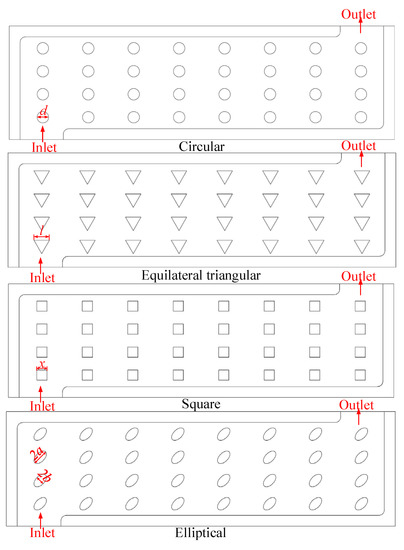 According to the basic model established in Section 2, four schemes are designed for the pin-fins with circular, equilateral triangular, square, and elliptical section shapes. To reduce the effect of other factors except for the shape, only the shape of the pin-fins is changed in this section, and the volume, number, and other parameters of the pin-fins are the same. The circular section is taken as the baseline. To have a moderate cross-section size, eWr (eLr) = 0.5 is taken, so the diameter of the circular section is 10.63 mm. The size parameters of other shaped cross sections are determined according to the circular section area shown in Table 4. The pin-fins of the four schemes are arranged 8 × 6 equally spaced. Figure 7 displays the four schemes for the cooling plate.