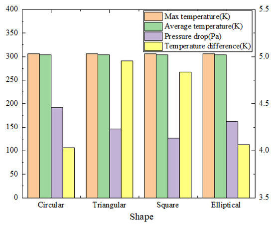 The battery’s temperature difference, average temperature, maximum temperature, and coolant pressure drop are shown in Table 5. The results are that the battery maximum temperature for the triangular section pin-fin scheme is the highest at 306.13 K. The maximum temperature for the square section pin-fin scheme is the lowest at 305.67 K, and it is 0.47 K smaller than that of the triangular section pin-fin scheme. The small difference in battery maximum temperatures between the elliptical section pin-fin and the circular section pin-fin schemes, which are 306.03 K and 306.06 K, respectively, is because of their similar shapes. The battery average temperature under the elliptical section pin-fin scheme and the circular section pin-fin scheme is larger than other schemes. In these two cases, the maximum temperature is 304.04 K and 304.06 K, respectively. The battery average temperature for the square section pin-fin scheme is the lowest at 303.74 K. The greater pressure drop on the coolant from the circular and elliptical section fins means that greater power consumption is required. The larger pressure drops on the coolant of 191.19 Pa and 162.02 Pa for the circular section pin-fins and elliptical section pin-fins, respectively, mean that greater power consumption is required. The square section pin-fins scheme has the smallest pressure drop on the coolant of 127.01 Pa, which effectively reduces the power consumption of the liquid pumped by the cooling plate. Both the elliptical section pin-fin scheme and the circular section pin-fin scheme have a smaller battery temperature difference. Although the temperature difference of the square section pin-fin scheme is larger, it has the smallest maximum temperature, average temperature, and pressure drop. In addition, the contour illustrates that the temperature of the square section pin-fin scheme varies uniformly and has a better temperature uniformity. Therefore, in a comprehensive comparison, the square section pin-fin cooling plate has the lowest power consumption and the best heat dissipation capability. For a more visual comparison, the effect of various section pin-fin shapes on heat dissipation is shown in Figure 9.