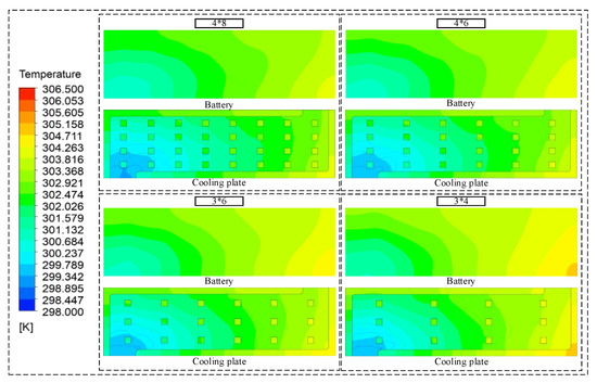 Figure 11 shows the battery’s heat dissipation results with different pin-fin numbers in the cooling plate. The overall temperature tends to decrease as the number of pin-fins increases, with the 3 × 4 pin-fins scheme having the highest temperature and the 4 × 8 pin-fins scheme having the lowest. The temperature in all four schemes varies uniformly along the liquid flow direction, and the maximum temperature occurs at the lower right corner of the cooling plate. It shows that the number of pin-fins has some influence on the heat dissipation capability of the cooling plate.