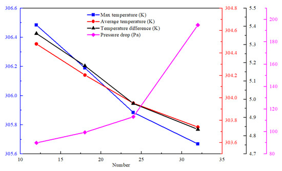 To more accurately analyze the influence trend of the cooling plate pin-fin’s number on the thermal capability, the calculated pressure drop, average temperature, and maximum temperature are listed in Table 6. To observe the trend more clearly, the variation trend of heat dissipation performance with the pin-fin’s number is shown in Figure 12.