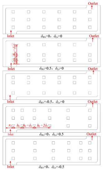 To represent the magnitude of the change in pin-fin distance, Equation (16) is the normalized distance increment defined, where δL and δW are the reality distance change of pin-fin. So, δLr = 0 and δWr = 0 mean that all pin-fins are equally spaced. δLr = 1 and δWr = 1 indicate that the degree of change reaches the maximum possible value.