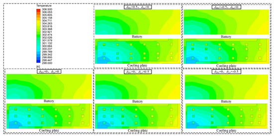 The heat dissipation results for the battery and cooling plate with different pin-fin distributions are shown in Figure 14. The results are that the pin-fin distribution has little effect on the temperature of the battery surface and the cooling plate. The five schemes in Figure 14 can achieve great temperature uniformity. The high-temperature region under the scheme with uniform pin-fin distribution is slightly smaller than under the other pin-fin distribution schemes. The high-temperature region in the lower right corner under the δLr = −0.5, δWr = 0 scheme is slightly larger than the high-temperature region in the lower right corner under the δLr = 0.5, δWr = 0 scheme because the pin-fins at the lower right corner under the δLr = −0.5, δWr = 0 scheme are denser and disrupt the coolant flow.