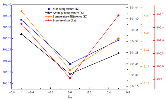 In Table 7, The different pin-fin distribution has little influence on temperature and pressure drop. When the pin-fin distribution is δLr = 0, δWr = 0, δLr = 0, δWr = 0.5, δLr = 0, δWr = −0.5, δLr = 0.5, δWr = 0 and δLr = −0.5, δWr = 0, the maximum temperature is 306.19, 306.27 K, 306.35 K, 306.32 K and 306.42 K, respectively. The pressure drops are 99.29 Pa, 103.15 Pa, 102.63 Pa, 102.57 Pa and 100.13 Pa, respectively. The average temperature is 304.20 K, 304.28 K, 304.35 K, 304.34 K and 304.41 K, respectively. The temperature difference is 5.18 K, 5.24 K, 5.29 K, 5.26 K and 5.33 K, respectively. The change in the four parameters is not obvious. The difference between their maximum and minimum values is 0.23 K, 3.86 Pa, 0.21 K and 0.15 K respectively. It can be seen from the variation trend of Figure 15 and Figure 16 that the average temperature, pressure drop and maximum temperature under the scheme of δLr = 0, δWr = 0 are relatively low, indicating that the power consumption and heat dissipation capability of pin-fins uniformly distributed in the cooling plate are relatively better.