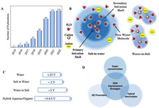 The superior performance of batteries based on organic electrolytes stems from the formation of stable SEI on the graphite anode thus expanding the ESW of these electrolytes from 3 V up to 4.2 V [8]. However, it is very difficult to realize a stable SEI in ordinary aqueous salt-in-water electrolytes because the reduction potential of water is very high compared to the decomposition potential of SEI-forming species. Thus, water decomposition is thermodynamically favored producing gaseous products instead of the reduction of the salt species. However, increasing the salt concentration in aqueous electrolytes significantly alters the decomposition potentials of water thus paving the way to the possibility of the formation of a robust SEI [23,24]. Figure 1A shows a significant increase in the number of publications from 2015 to 2022 related to WIS electrolytes. A graphical representation of the water solvation structure in ordinary salt-in-water and water-in-salt electrolytes is presented in Figure 1B. Comparison of ESW for different electrolyte systems and strategies adopted to enhance ESW are given in Figure 1C and Figure 1D, respectively.