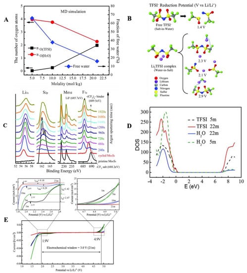(A) No of O2 atoms of H2O and TFSI in the primary solvation shell (0.27 nm) of Li+ and the fraction of free H2O calculated through Molecular Dynamics Simulations; (B) predicted reduction potentials calculated via G4MP2 Quantum chemical calculations; (C) XPS spectra of pristine and cycled Mo6S8 anode; (D) “HSE06 DFT calculations” Projected DOS for LiTFSI-H2O; (E) ESW measurement on stainless steel electrode by CV at 10 mVs−1, 1 m (black), 5 m (green), 10 m (blue), 21 m (red). (A–D) are reprinted with permission from Ref. [17] Copyright 2015, AMERICAN ASSOCIATION FOR THE ADVANCEMENT OF SCIENCE.