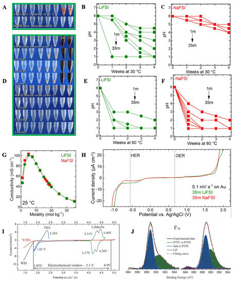 (A) photographs of LiFSI and NaFSI samples; (B,C) pH evolution of LiSFI/NaFSI as a function of time at 30 °C; (D) photographs of LiFSI and NaFSI samples at 60 °C; (E,F) pH evolution of LiSFI/NaFSI a function of time at 60 °C; (G) conductivity of LiFSI/NaFSI vs. concentration at 25 °C; (H) ESW of 35 mol kg−1 solution of LiFSI and NaFSI at 0.1 mV on Au electrodes; (A–D) are Reprinted with permission from Ref. [31] Copyright 2019, Elsevier B.V. (I) ESW of 28 molal water-in-(bi)salt (WIBS) electrolyte (21 mol kg−1 LiTFSI 7 mol kg−1 LiOTF); (J) XPS spectra showing the formation of LiF based SEI in the WIBS electrolyteand (I,J) are Reprinted with permission from Ref. [23], Copyright 2016, John Wiley & Sons, Inc.