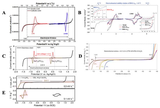 (A) CV of LTO and LNMO along with ESW in a DMC/LiTFSI/H2O hybrid electrolyte; Reprinted with permission from Ref. [37], Copyright 2018, Elsevier B.V. (B) CV of LTO & LMO with ESW estimated in acetonitrile/LiTFSI/H2O (BSiS-A0.5) and DMC/LiTFSI/H2O (BSiS-D0.28) hybrid electrolytes; Reprinted with permission from Ref. [38], Copyright 2019, John Wiley & Sons, Inc. (C) ESW of hybrid electrolyte made with 7 m NaOTF in water + 8 m NaOTF in PC; Reprinted with permission from Ref. [39], Copyright 2018, American Chemical Society; (D) ESW of molecular crowding electrolytes composed of PEG/H2O/LiTFSI; Reprinted with permission from Ref. [40], Copyright 2020, Springer Nature, LTd (E) CV of LTO/LMO and ESW estimation in hybrid sulfolane/H2O/LiClO4 electrolyte; Reprinted with permission from Ref. [41], Copyright 2022, John Wiley & Sons, Inc.