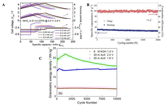 Apart from secondary ion batteries, the WIS electrolytes are also used in supercapacitors, and the devices showed much higher cell voltages compared to ordinary dilute electrolytes together with the advantages of high-power density and safety of aqueous electrolytes. Apart from symmetric devices, asymmetric supercapacitors were also fabricated using WIS electrolytes. A good example is a hybrid supercapacitor demonstrated by Zhang et al. including a well-protected Li anode coupled with a pseudocapacitive MnO2 cathode, which delivered a high cell voltage of 4.4 V, a specific energy of 405 Wh kg−1, and a power density of 0.88 kW kg−1. The galvanostatic charge–discharge curves are reported in Figure 8A [73].