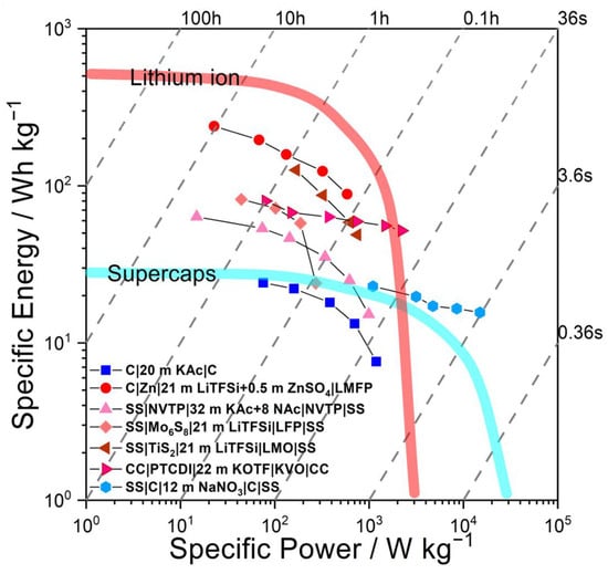 Ragone plot of several WIS full cells cited in this work. Specific energy and specific power have been calculated at the materials level, using the total amount of active material. Battery-like cells are in different shades of red, supercaps in blue. For the sake of comparison, traditional LIBs and supercaps are also shown calculated at the materials level.