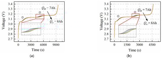 Figure 2 shows that the influence of the changes in Qn on the voltage curve is not consistent throughout the whole charging process with different charging rates. Number ➀ and ➁ positions of the voltage curve bundle present the discrete phenomenon, and the curve bundle at other positions during the charging process is almost overlapped. This phenomenon indicates that micro-health parameters, Qn, can be identified at number ➀ and ➁ positions under the constant-current charging condition. In addition, the sensitivity of Qn on the battery voltage bundle under 0.5 C and 1 C constant-current charging conditions exhibit the same results, which means the accurate identification of Qn has nothing to do with the current rate and can be obtained under the larger rate constant-current charging condition.